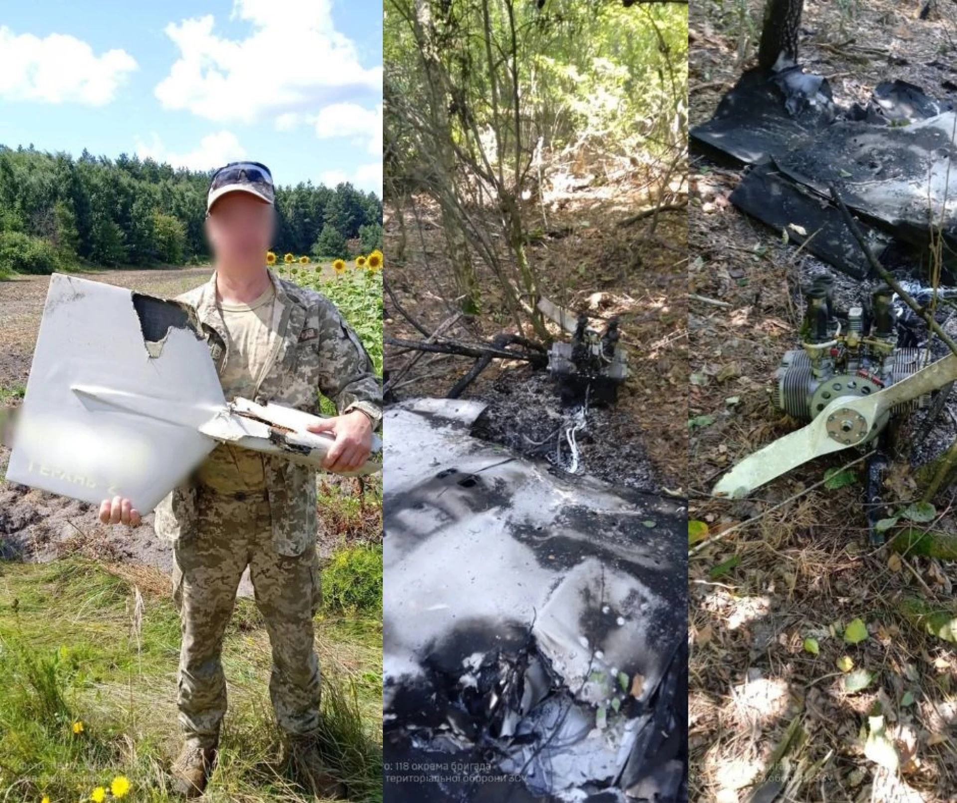Захисники 118-ої окремої бригади ТрО показали світлини знищеного російського безпілотника. Фото опублікували на сторінці бригади.